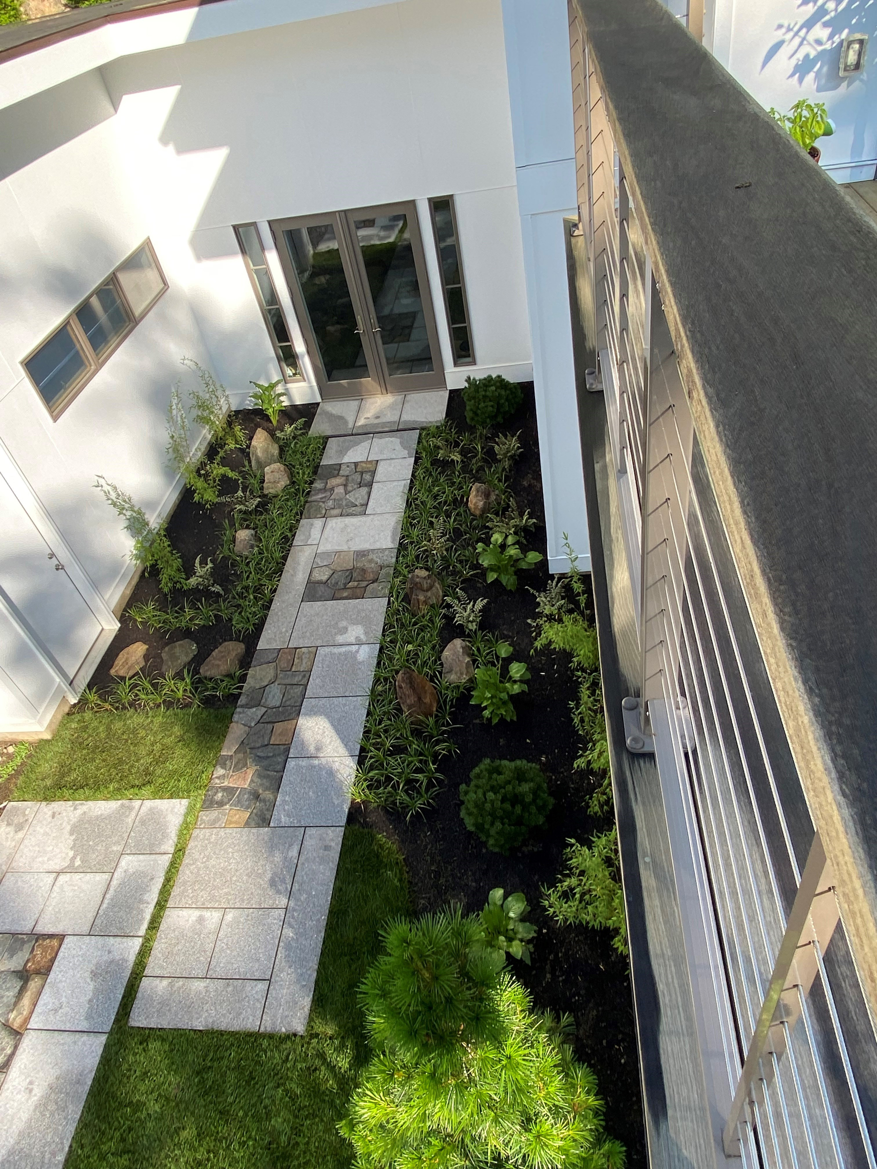 The project called for a design that would naturally guide visitors toward the home's recessed entrance. In response, we utilized two rectangular nobe-dan—a traditional Japanese-style paved path—to create a space that harmonizes perfectly with the contemporary residence.